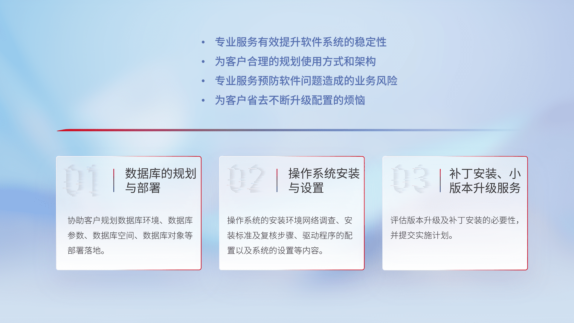 为客户提供软件规模升级、、、快速部署、、、按需配置的专业服务,,,,从数据库的规划与部署到操作系统的安装与设置,,,再到补丁安装和小版本升级提供支持。。。。